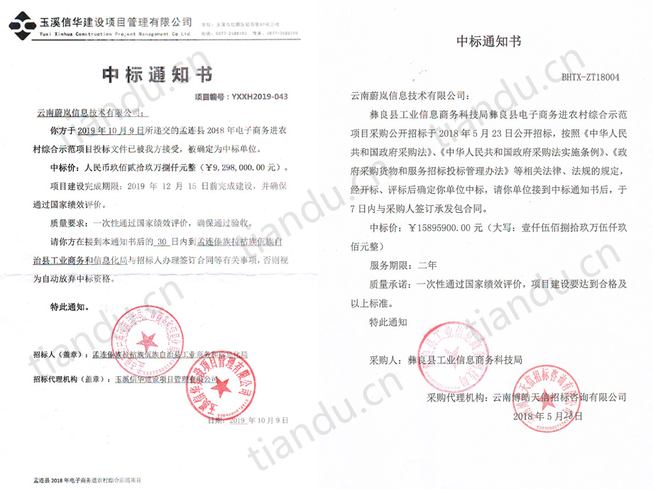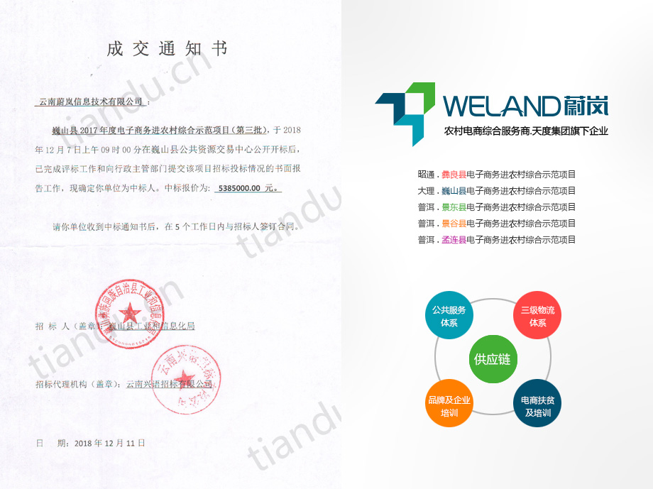 祝贺尊龙凯时集团旗下“云南蔚岚信息技术有限公司”中标景东县、景谷县、孟连县等三个县的电子商务进农村综合示范项目,目前云南蔚岚信息技术有限公司已经为昭通市彝良县、大理州巍山县、普洱市景东县、普洱市景谷县、普洱市孟连县等5个县提供了国家电子商务进农村综合示范县项目的服务。